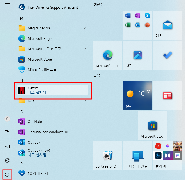 사진에서 보이는 것처럼 전원 버튼을 누르면 목록이 열리고 N열에 새로 설치된 넷플릭스가 보입니다.