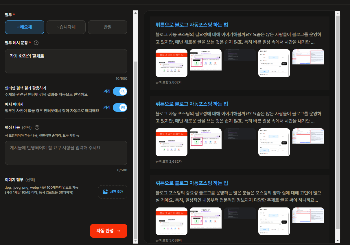 모든 입력이 완료되면 ‘자동 완성’ 버튼을 클릭하여 AI가 글을 생성하도록 합니다. 그러면 AI가 입력한 주제와 키워드를 기반으로 블로그 포스팅을 자동 생성합니다.