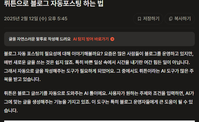 위의 화면처럼 AI가 서론, 본론, 결론이 포함된 포스팅을 자동으로 생성합니다. 하지만 글의 논리적인 흐름이나 맞춤법 등을 체크한 후 수정하는 것이 중요합니다.