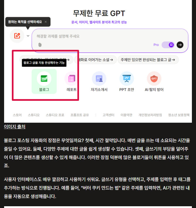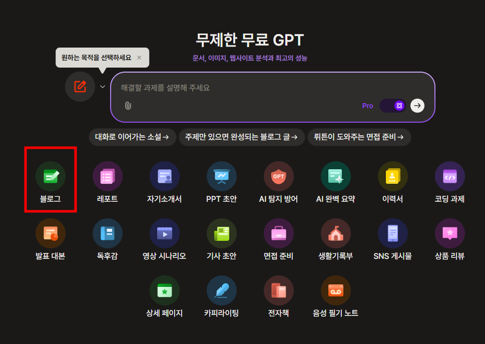 로그인 후에는 다양한 글쓰기 기능을 선택할 수 있는 메인 화면이 나타납니다. 여기서 ‘블로그’ 기능을 선택하면 AI를 활용한 블로그 글쓰기가 가능합니다.