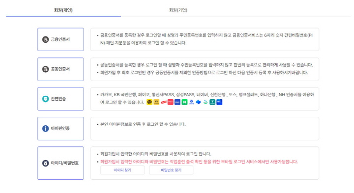 로그인을 진행하시면 됩니다. 다행히 간편 인증이 있어서 카카오톡, KB국민은행, PASS 등으로 손쉽게 로그인 가능합니다.