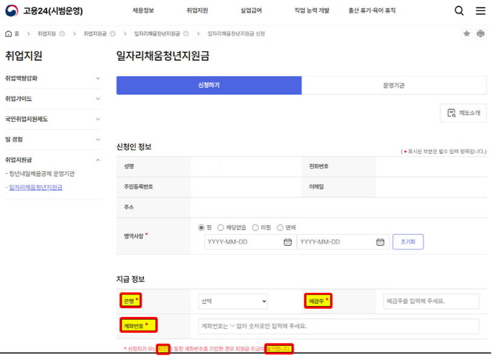 신청인 정보가 자동으로 들어오게 됩니다. 그리고 지급정보는 직접 작성해주셔야 하고 당연 본인 계좌만 지급이 가능합니다.