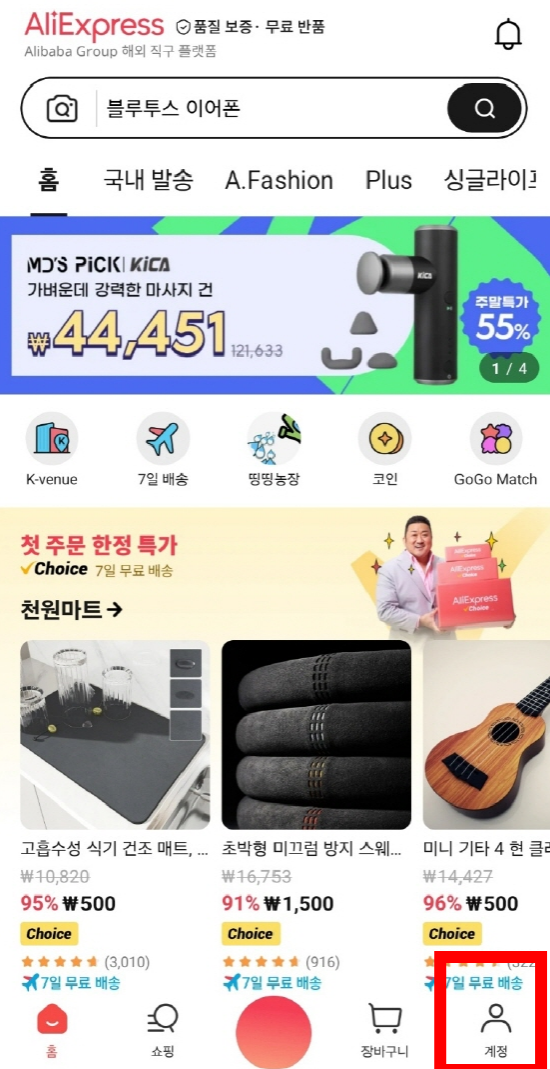 의외로 알리익스프레스의 겨레방법은 간단합니다. 우선 메일화면에서 계정화면을 클릭합니다