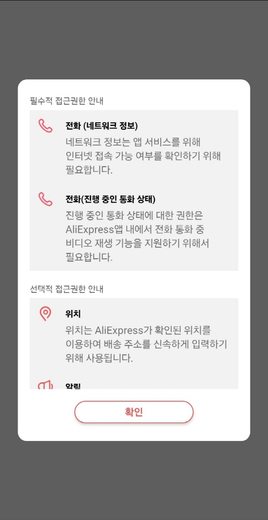 설치가 끝나면 제일 먼저 필수적 접근권한이 나오는데요. 확인을 눌러주세요.