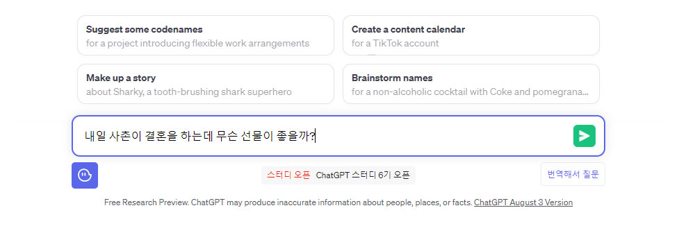 내일 사촌이 결혼을 하는데 무슨 선물이 좋을까?라고 쓰고 엔터를 누르시면 자동으로 한글을 영어로 바꿔줍니다.