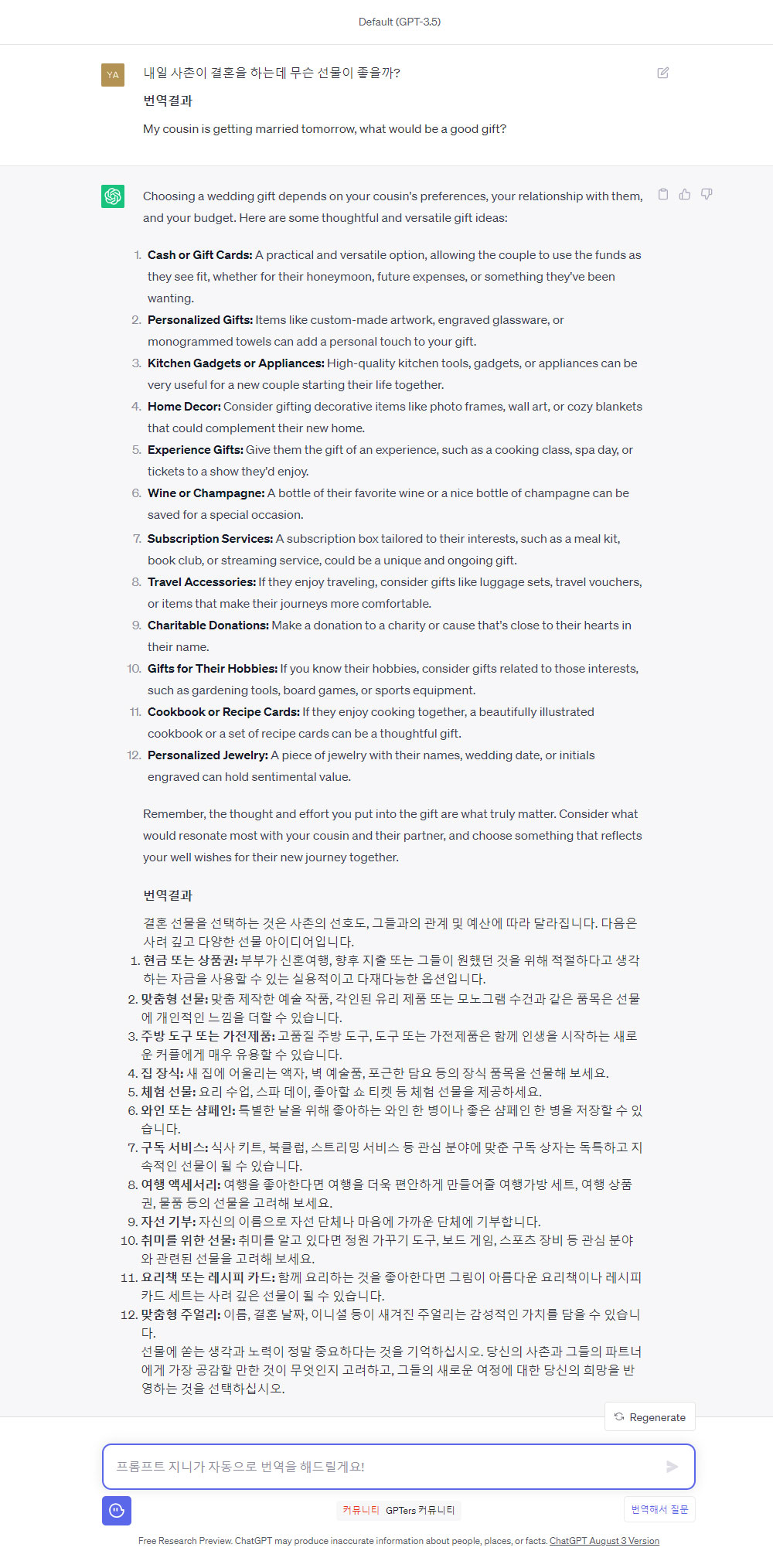물론 ChatGPT의 정보를 100%로 신뢰하기에는 이릅니다. 몇 번이고 검토하시길 당부드립니다. 기본적인 영어 회화 및 교정 등은 아주 훌륭한 편이니 이 부분 참고하셔서 사용하시면 좋겠습니다.